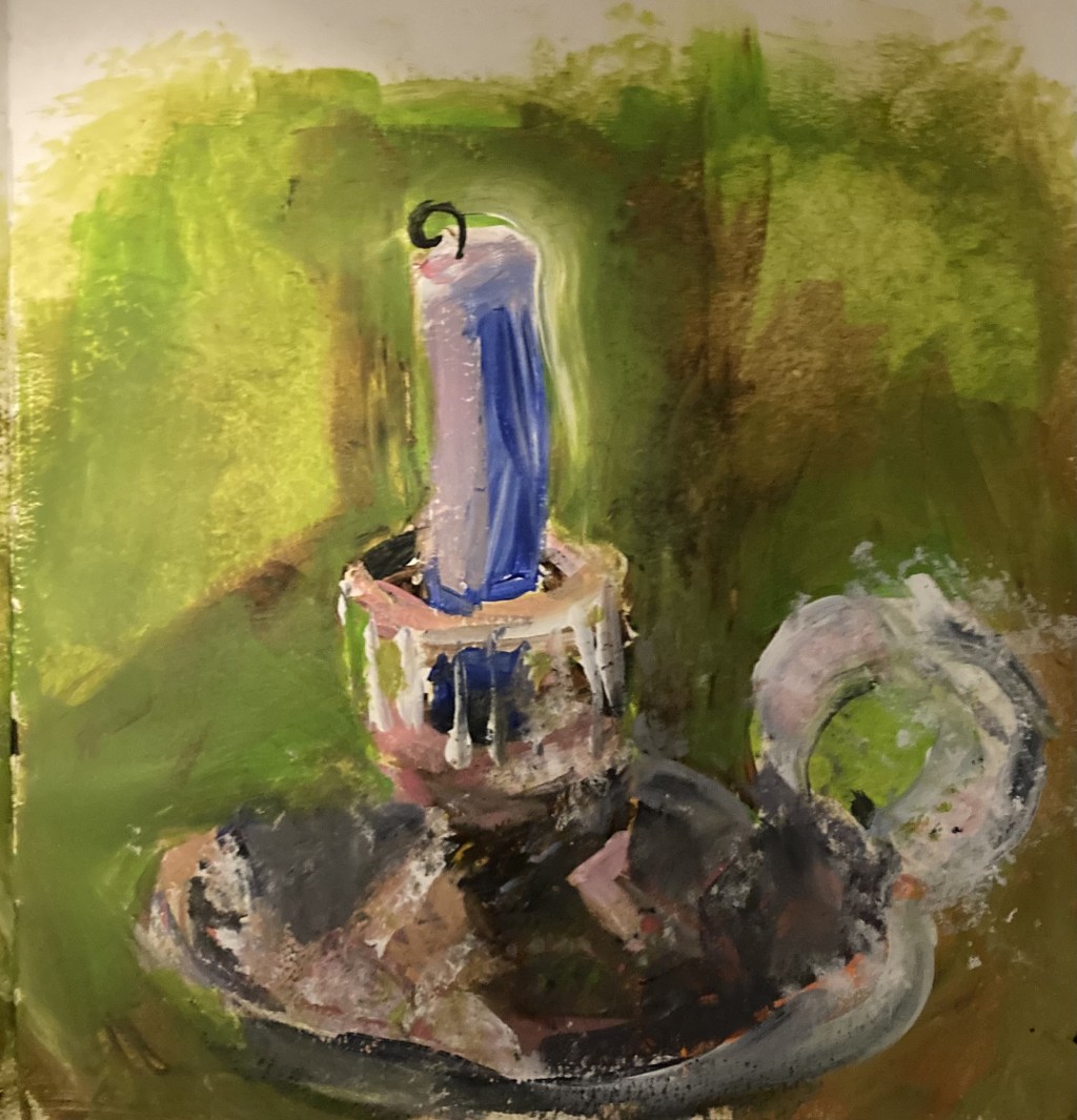 Started painting my candlestick holder this rainy afternoon. I was excited to try out 1) my new paint set 2) a metallic subject. Maybe a bit ambitious -but I’m pleasantly surprised by how this is going! The green is a bit sick, and the shapes are wonky. I’m getting a lot of emotion.